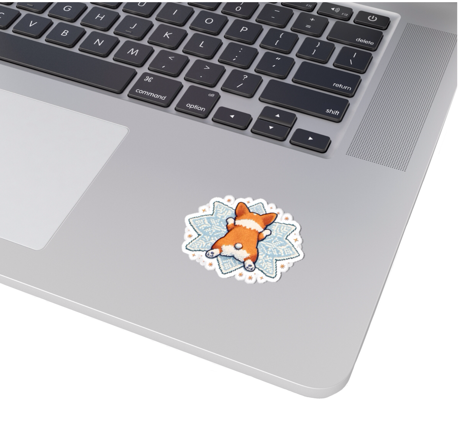 Corgi Sploot on Snowflake Kiss-Cut Sticker — Cute Winter Laptop Decal